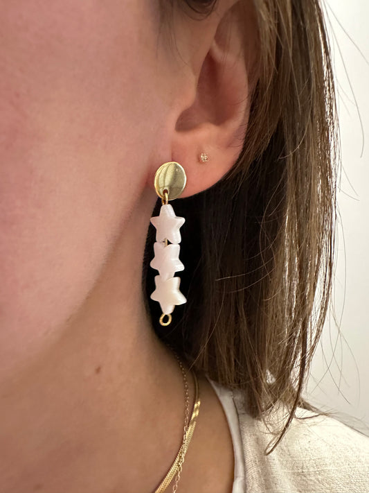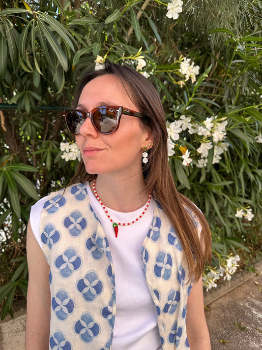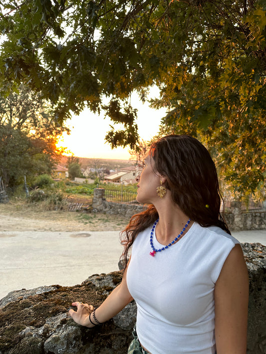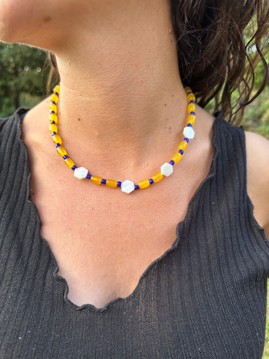 Collar de cerámica amarilla y cuentas azules con 4 hexágonos de nácar