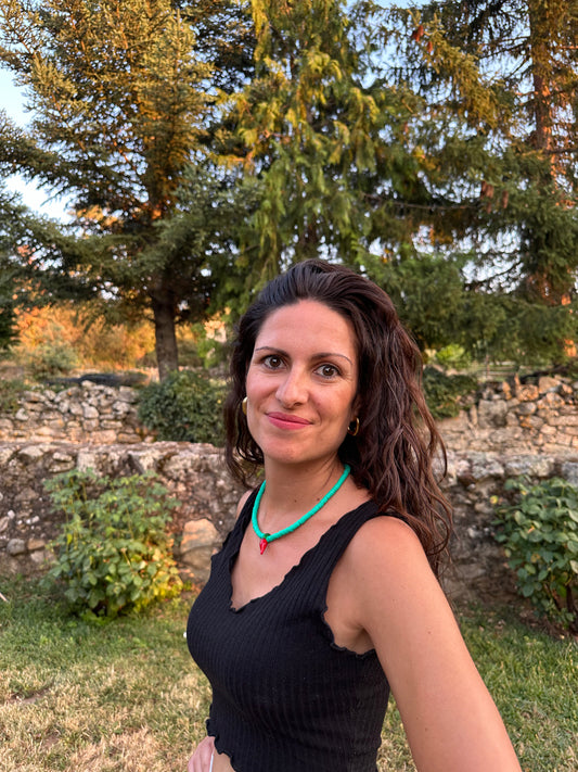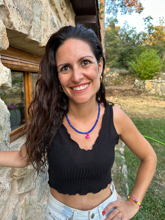 Collar con cerámica azul, piedra agata de árbol y patito rosa